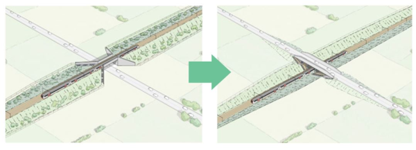 Illustration showing how lowering the route to pass under rather than over a road can reduce visual impacts.