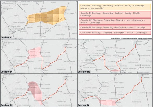 - Corridor C: Bletchley – Stewartby – Bedford – Sandy – Cambridge.