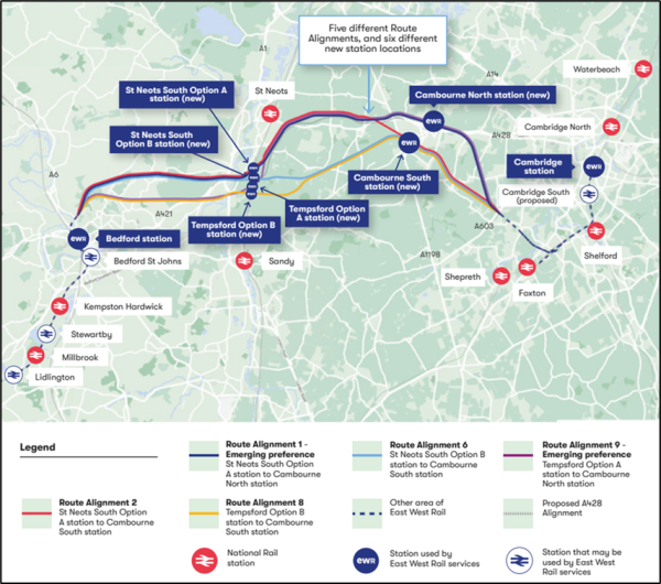 - Alignment 9 – Tempsford to Cambourne North (via the new A421 dual carriageway corridor). This option also includes Cambourne North as the emerging preferred Cambourne option.