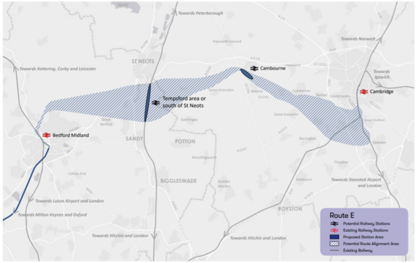 - Construction of a new railway between Bedford and Cambridge, including the construction of new stations at Tempsford and Cambourne.