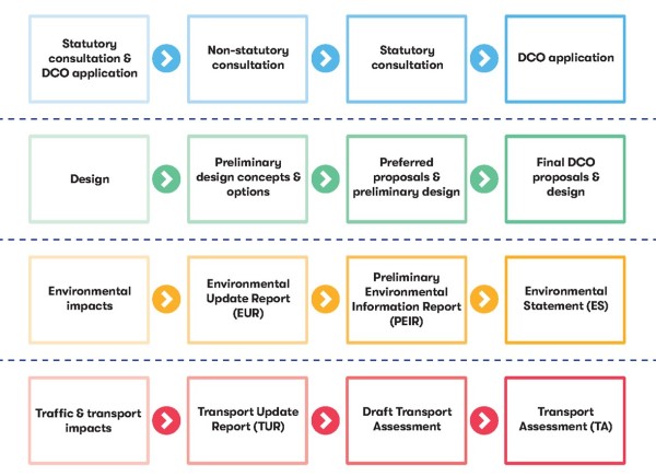 Figure 1-1: Consultation stages through to DCO application – an overview of the development of key design, environmental and transport content at each stage