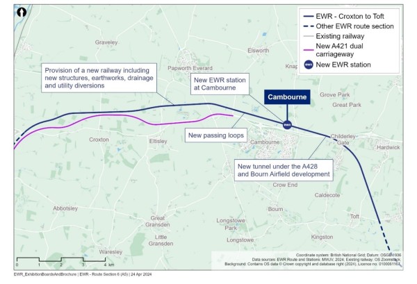 - Construction of a new railway between Bedford and Cambridge, including the construction of new stations at Tempsford and Cambourne.